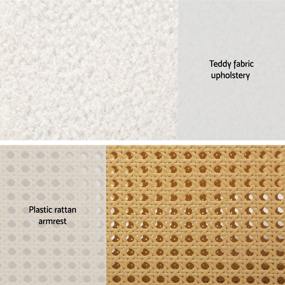 Allow your body to completely relax after a hard day�s work with the soft, cosy embrace of an Rocking Chair. Crafted with premium teddy fabric and PE rattan, the rocking chair exudes vintage elegance, adding a touch of luxury to your space. The soft and plush texture, thick cushioning and classic design invite you to kick back and relax, creating a cosy oasis for relaxation and comfort. The gentle rocking motion can help relax the body and rejuvenate the soul. A solid rubberwood frame and legs keep the chair stable and secure and allow for a weight capacity of 150kg. Anti-slip pads keep the chair in place and prevent scratches on your floors. Vintage-style rattan armrests make the chair practical as well as comfortable. Use our chair for relaxation, nursing, or simply enjoying the day. Get your Rocking Chair today.