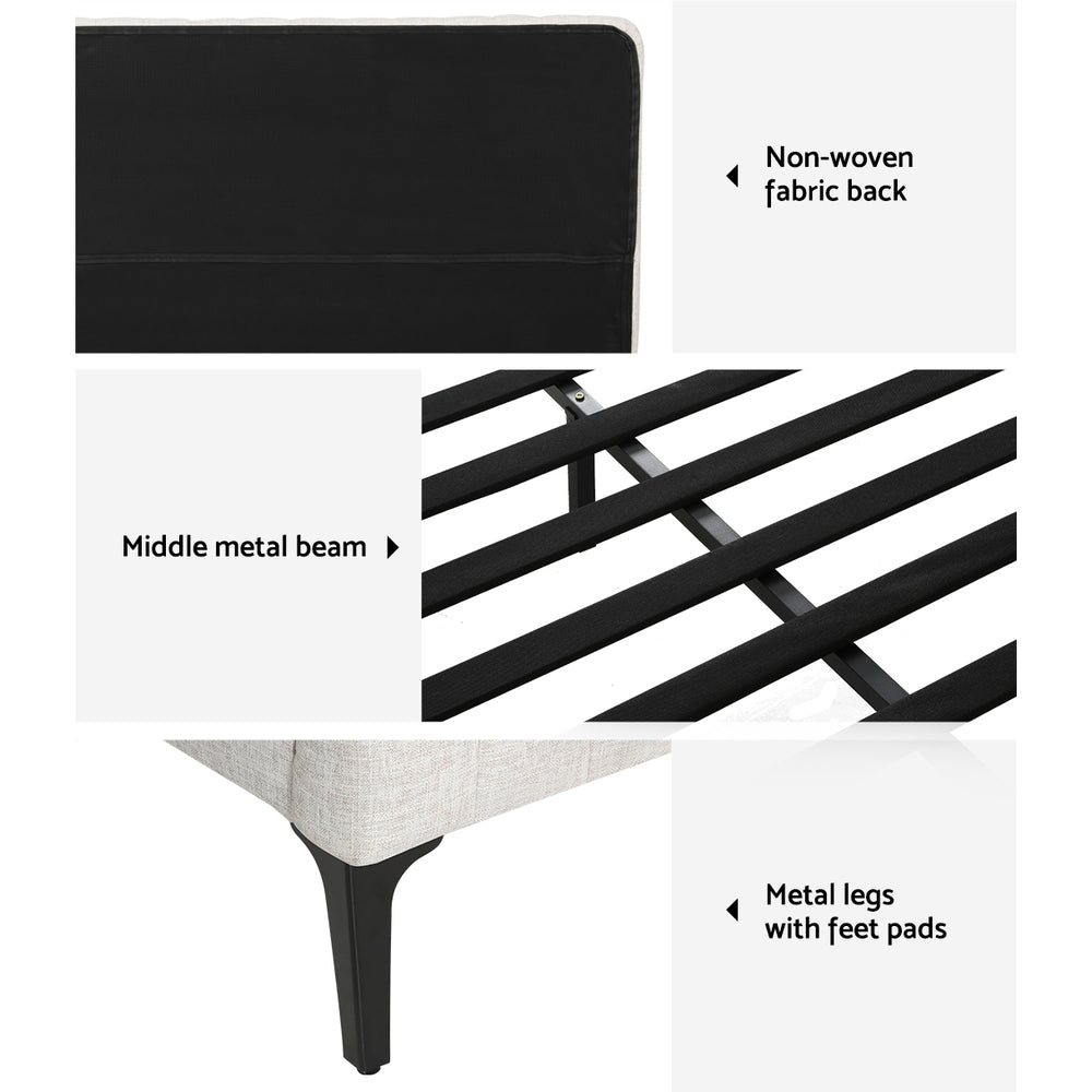 Add a touch of cosiness to your bedroom with our Artiss AMMY Bed Frame. Wrapped in premium faux linen fabric, the bed frame is aesthetically pleasing and extremely pleasant and smooth to the touch. The non-woven fabric is incredibly breathable to prevent moisture and bacteria build-up. The gorgeous cream shade enables you to style it in any bedroom, and it'll seamlessly blend into your home decor. The bed frame comes attached with a textured bed head and matching bed foot for a cohesive aesthetic. It has high-density foam padding, which makes it a cosy spot to sit back and relax, watch a movie, or read a book. Furthermore, the wide wooden slatted base provides a sturdy foundation and allows for proper ventilation for a fresh and dry mattress always. This bed frame has premium heavy-duty metal fixings and solid powder-coated steel legs, so you don't have to worry about stability. The bed frame is available in king and queen and fits Australian standard-size mattresses. Experience the sweetest dreams with the Artiss AMMY Bed Frame today.