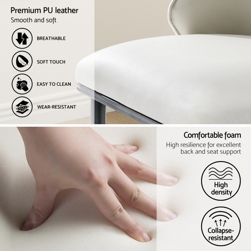 Wine, dine, and entertain guests with our meticulously designed Dining Chair. They make a gorgeous addition to any dining space and will make your guests envious of your gorgeous dining ambience. Not just for your dining room, these dining chairs are sure to make a statement in your study room, living room, and dressing room. Their versatility and ultra-modern design make them stand out. Incredibly stylish and sophisticated, our Dining Chair features a durable inner solid wood frame that ensures lasting quality and ultimate durability. It comes with solid steel legs with anti-slip foot pads for ultimate stability and to keep your floors scratch-free. The dining chairs flaunt plush PU leather seats with a contoured backrest that offers incredible comfort and support and allows you to dine comfortably. Our dining chairs can hold up to 150kg weight, and their reinforced steel fixings make them super stable and reliable. Our dining chairs are certainly a big bang for your buck. Bring home this gorgeous set of dining chairs without any hesitation.